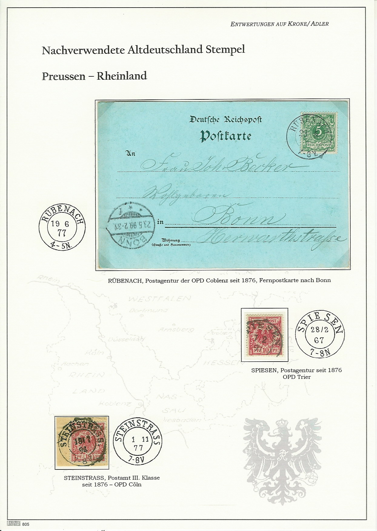 Ich bin gerade dabei, meinen Sammlungsteil "Entwertungsformen der Krone/Adler Serie" neu zu gestalten. Ziel dieser Sammlung ist es, alle auf dieser Freimarkenserie möglichen Entwertungsformen aufzuzeigen und in Beispielen zu belegen. Beginnend bei den Altdeutschland-Nachverwendungen über die Übergangsstempel, Aptierungen, Normstempel, Klaucke, Schilling, Pfannstiel, Hupp, etc. bis hin zu den neueren Formen wie Zwischentype, Kreisobersegment und schließlich die Gittersegmentstempel in all ihren Varianten. Neben den genannten Stempelformen sollen aber auch andere mögliche Entwertungen wie Inndendienst-Stempel, Dienstsiegel, Stempelmaschinen, Rohrpost, Bahnpost und Schiffspost sowie handschriftliche Entwertungen gezeigt werden. Auch mögliche Ausländische Entwertungsstempel. Aber: Es geht ausschließlich um die möglichen Entwertungen der Markenausgabe Krone/Adler - also es muß immer eine Krone/Adler Marke oder Ganzsache im Spiel sein !!!