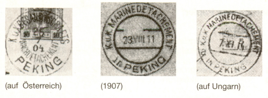 Ende 1907 wurde die Bezeichnung "K. und K. Gesandtschafts-Wach-Detachement-Peking" in "K. u. K. Marinedetachement-Peking" umbenannt. Bis dato konnten 3 verschiedene Poststempel festgestellt werden (siehe Anhang).