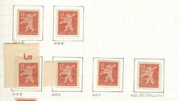 Hier also eine Seite aus der Zeit der Besetzung der sowjetischen Zone in West-Sachsen, auf welcher der Vorbesitzer eine Anzahl der Mi-Nr.126-128 mit Plattenfehlern und Druckzufälligkeiten zusammengestellt hat: -