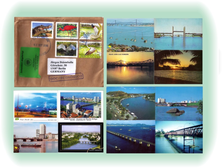 Ein SWAP (Tausch) Briefmarken aus Deutschland gegen Brückenmotiv-Karten aus Brasilien in einem liebevoll frankierten Umschlag.