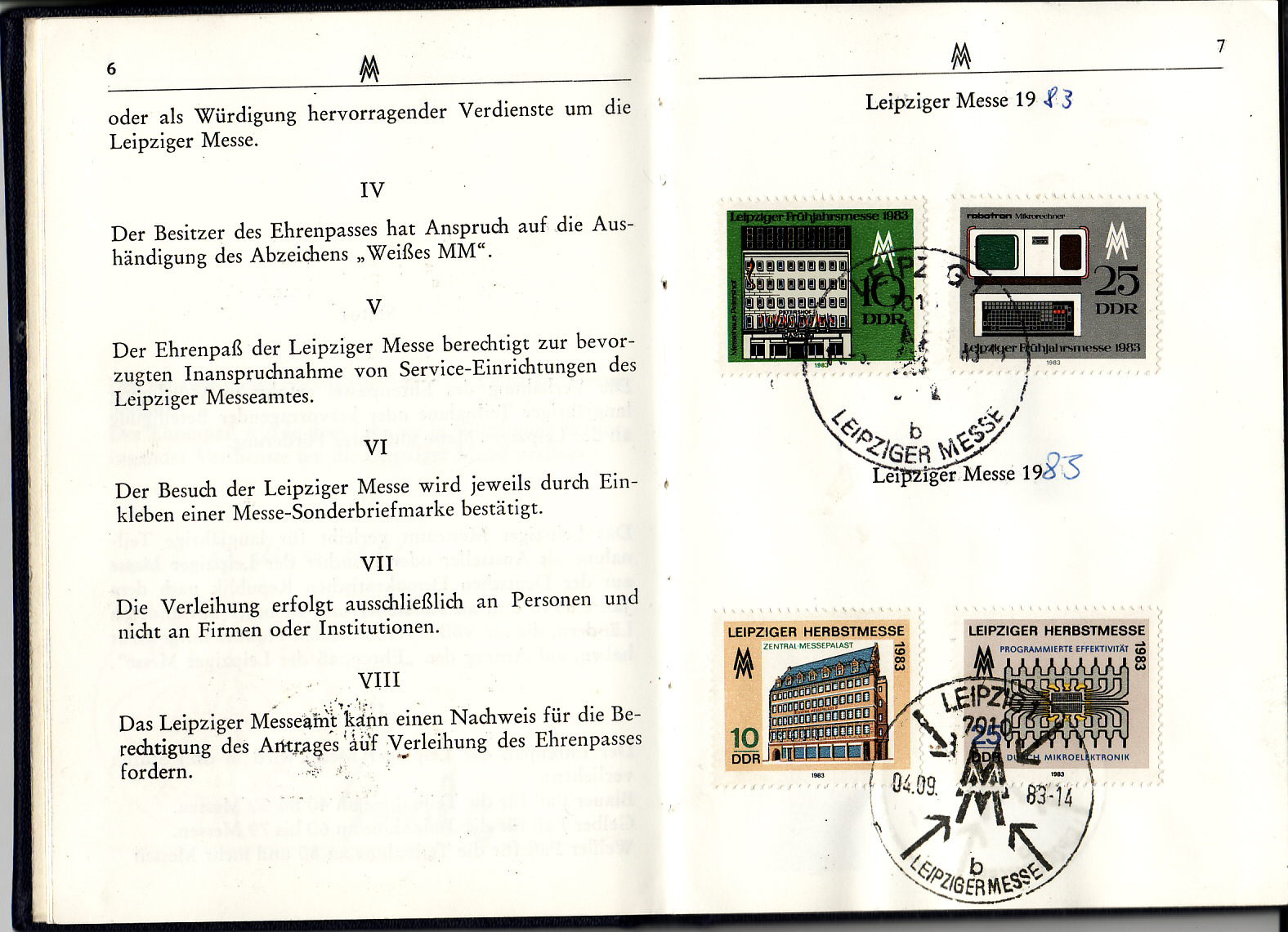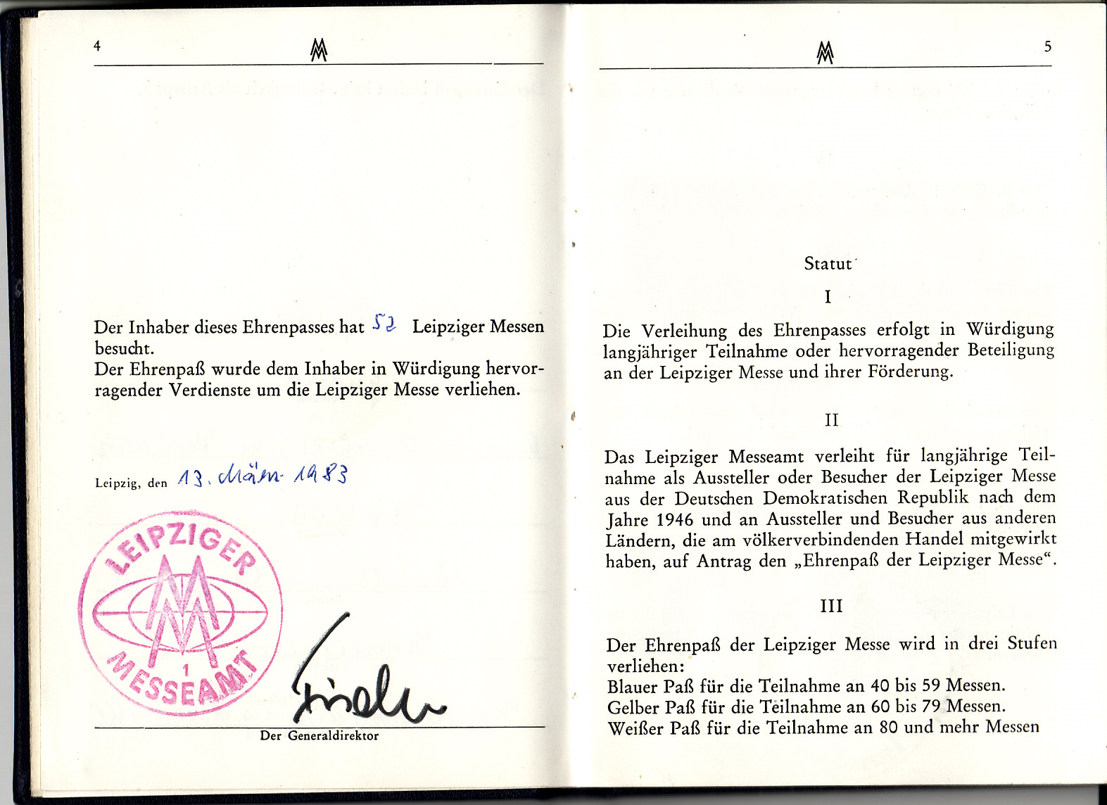 Der Inhaber hat die Messe bis Herbst 1986 besucht. Das war dann sein 59'ter Messebesuch. Sollte er zur Fühjahrsmesse 1987 gekommen sein, hat er lt. Statut den nächsten Ehrenpass in Gelb bekommen (ist wohl auch anzunehmen). Die Handhabung des Passes ist aus dem Statut zu erlesen.