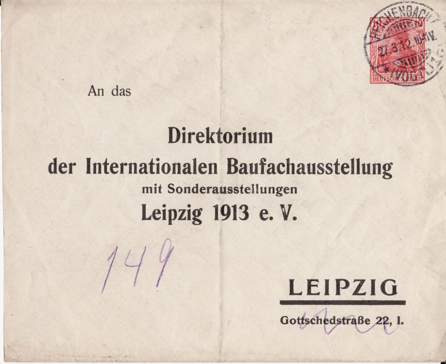 So da möchte ich auch mal wieder etwas zeigen. Ein GSU mit 10 Pf Germania. Interessant für mich ist der Addressat (Zudruck?): das Direktorium der Internationalen Baufachausstellung. Dieser Verein war für die großartige Ausstellung von 1913 auf dem späteren alten technischen Messe-Gelände verantwortlich.