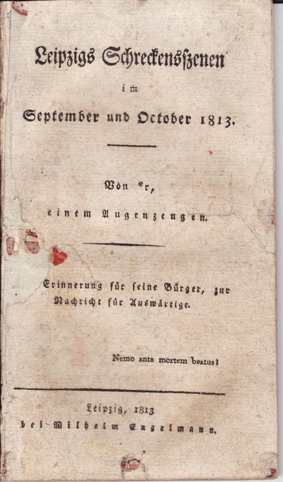 Einen direkten Einfluss auf die Messe in Leipzig hatte die französische Besetzung Leipzigs unter Napoleon. Durch die Kontinentalsperre waren vor allem Kaufleute aus England von den Messen ausgeschlossen. Selbst die in Leipziger Magazinen lagernden englischen Waren wurden von der französichen Verwaltung beschlagnahmt und dann später durch die Stadt erworben. Ein Ende der französischen Besatzung in Leipzig war die vom 16.-18.Oktober 1813 stattfindende Völkerschlacht bei Leipzig. Im Anhang zeige ich einen in der letzten Woche erstandenen 62 seitigen Augenzeugenbericht noch aus dem selben Jahr. An der Schlacht mussten 520.000 Soldaten aus ganz Europa teilnehmen. Die Verhältnisse in der Stadt vor, während und nach der Schlacht waren katastrophal. Nicht nur das Leipzig für die ständige Aufnahme von Soldaten zu tragen hatte, hinzu kamen jeweils noch hohe Kontributionen. Der Stadt wurde ein Großteil der Verwundeten überlassen. Die städtischen Einrichtungen waren über alle Maßen überlastet.