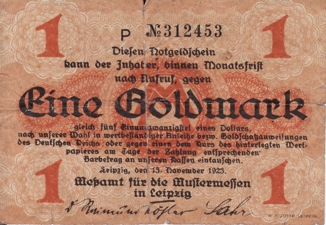 auf Seite 3 konnte ich schon mal einen 20 Goldpfennig-Schein aus der Hochinflation Nov. 1923 zeigen. Heute kann ich Euch aus der selben Serie Eine Goldmark zeigen.
