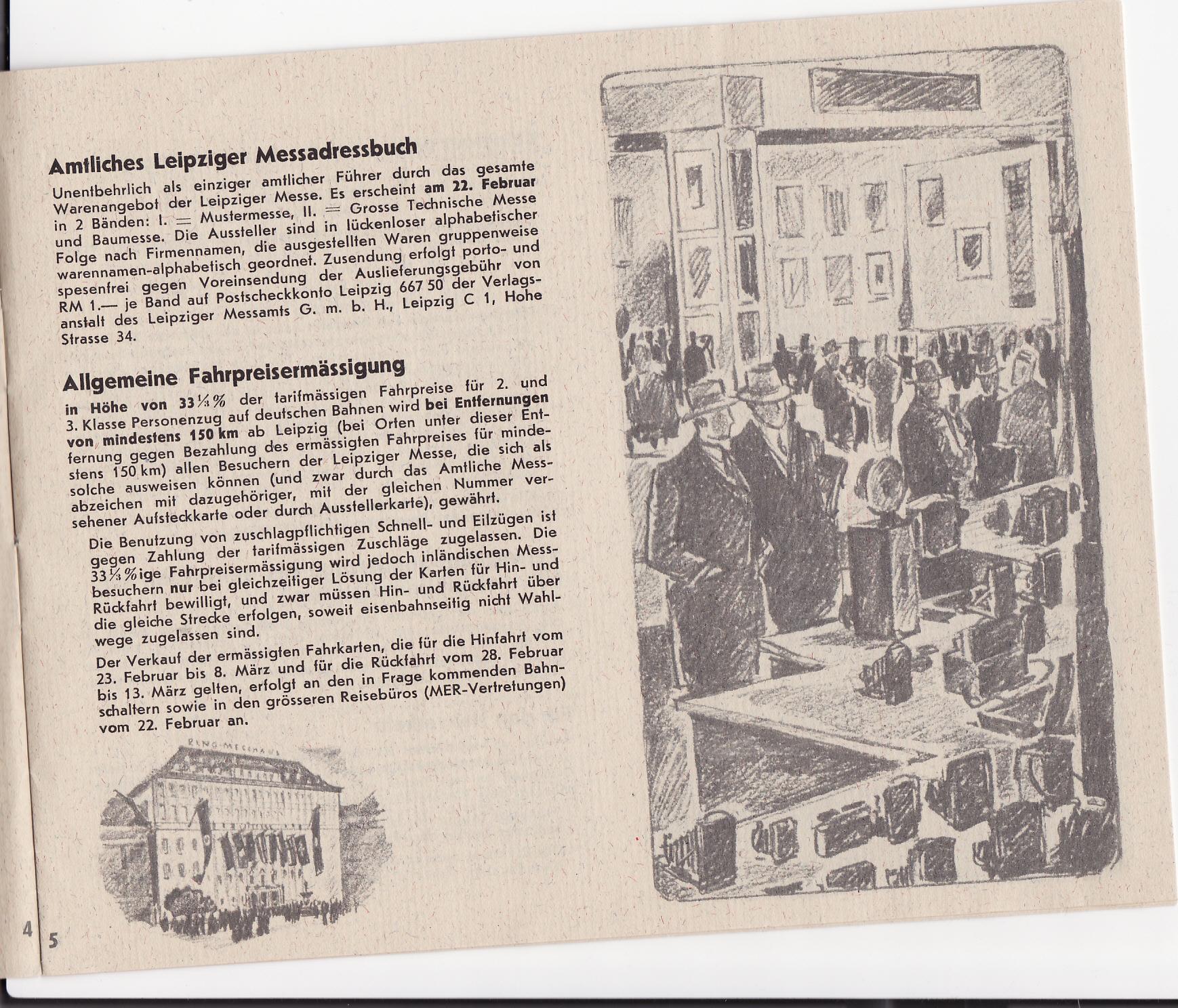 Heute möchte ich Euch eine Einladung von der Frühjahrsmesse 1937 zeigen. Hier wird der werte Messeaussteller und -besucher über Preise, Vergünstigungen und die verkehrstechnischen Verbindungen (Bahn und Flugzeug) informiert. Ganz wichtig sind die Preise für das Messeabzeichen und -ausweis. Das es preiswerte Unterkünfte und Verpflegung gegeben haben soll, kann ich mir nur schwerlich vorstellen. Zur Messezeit hat die Gastronomie den Umsatz des Jahres in Leipzig und Umgebung gemacht. Viele Haushalte hatten ihren eigenen "Messonkel" der regelmäßig zur selben Familie kam. Er war fast ein eigenes Familienmitglied. Für den "Messonkel" wurde oft die gute Stube frei gemacht.