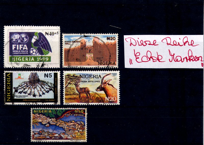 Heute sind die Nigeriafälschungen von Christine angekommen - et voilá hier sind sie. Die erste Karte sind echte Nigeria-Marken, die vier weiteren dann alles Fälschungen.