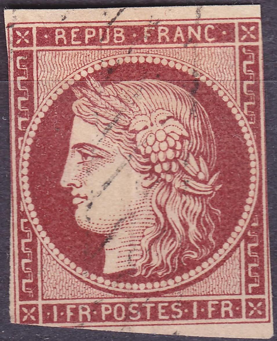 von der Michel-Nr. 17 gibt es auch einen Neudruck von 1863, der weniger wert ist als das Original. Ob die Farbe jetzt karmin oder dunkelkarmin ist, keine Ahnung. Die Rückseite sieht nicht so gut aus, gibt es da Fenster (dünne Stellen) im Papier, sind die dunklen Flecken im Papier drin? So was kann den Preis natürlich enorm reduzieren. Vielleicht machst Du mal eine Anfrage an die Arge Frankreich, die kennen sich mit diesen Uraltmarken und ihrer Erhaltung besser aus.