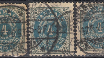 Die Marke mit der weiten Zähnung wurde am ?5.12.02 in Kopenhagen mit einem Brotype-Stempel (KGS) entwertet. Damit fällt sie genau in den Zeitraum in dem die Marke mit dem Wz. Krone II durch die Marken mit dem Wz. Krone III abgelöst wurden. Wenn die farben an meinem Bildschirm korrekt dargestellt werden, dann neige ich zur letzten Auflage mit Wz. Krone II, also der 21. Auflage vom Dezember 1901. Farben nach Afa-Special lys indigo/ren grå.