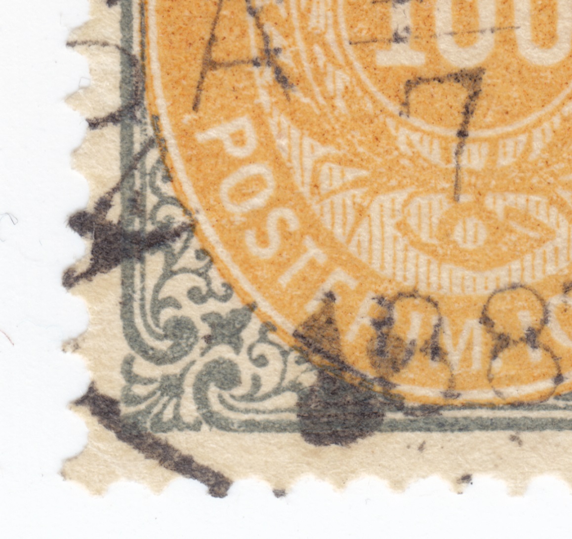 Mi. 31 II YA, sollte also AFA 31y sein. Ich zähle 14 Zähne oben, also enge Zähnung. Passt. Kopfstehender Rahmen, passt. Der Stempel könnte von 1897 sein, zusammen mit dem kopfstehenden Rahmen wohl Zuordnung zum 4. Druck, Oktober 1895, OMV.RM., grüngrau/gelb. Alle 100 Öre ab 3. Auflage 1891 Rahmenhauptgruppe 5.