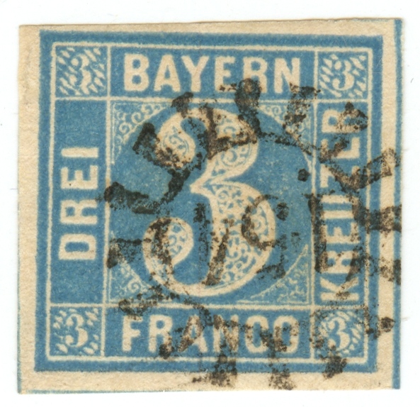Nr. 2 Platte 5 mit dem geschlossenen Mühlradstempel 598 von Würzburg, der ab 12/1856 gelegentlich bei der dortigen Hauptbriefpostexpedition geführt wurde.