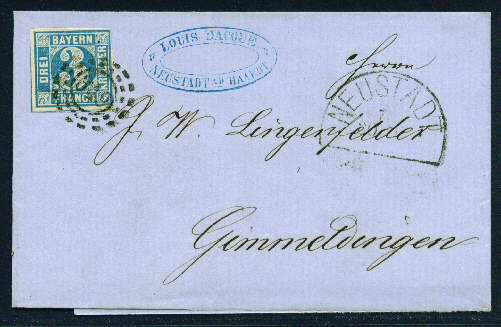 Der Brief mit der 2-IV von 1862 stammt von Louis Dacque, der hier ein Bankhaus unterhielt (siehe scan) und von dem eine entsprechend große Korrespondenz erhalten geblieben ist (ca 20 % meiner Neustadt-Belege aus der Quadratmarkenzeit hat irgendwie mit diesem Absender / Empfänger zu tun).