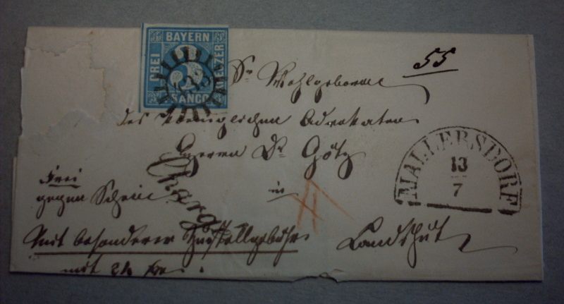 Der Mühlradstempel 433 von Mallersdorf wurde nur bis zum 19.11.1856 dort geführt, so dass der Brief mit einer 2II Platte 2 (nicht gut zu erkennen) vermutlich von Juli 1851 bis Juli 1856 stammen müsste.