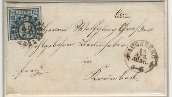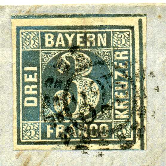Die linke ist eine eindeutige Platte 3: Stempel 175 Landshut erste Verteilung und erstes Mühlrad überhaupt, typische Farbe, für diese Platte guter Zustand, daher wohl 1854 gedruckt, durch Einpassungen - gab es schon bei der Urplatte - leicht gerundete Ecken. Man achte auf die beiden Ausbeulungen unten links und rechts der weissen Linie - das kennt keine andere Platte.