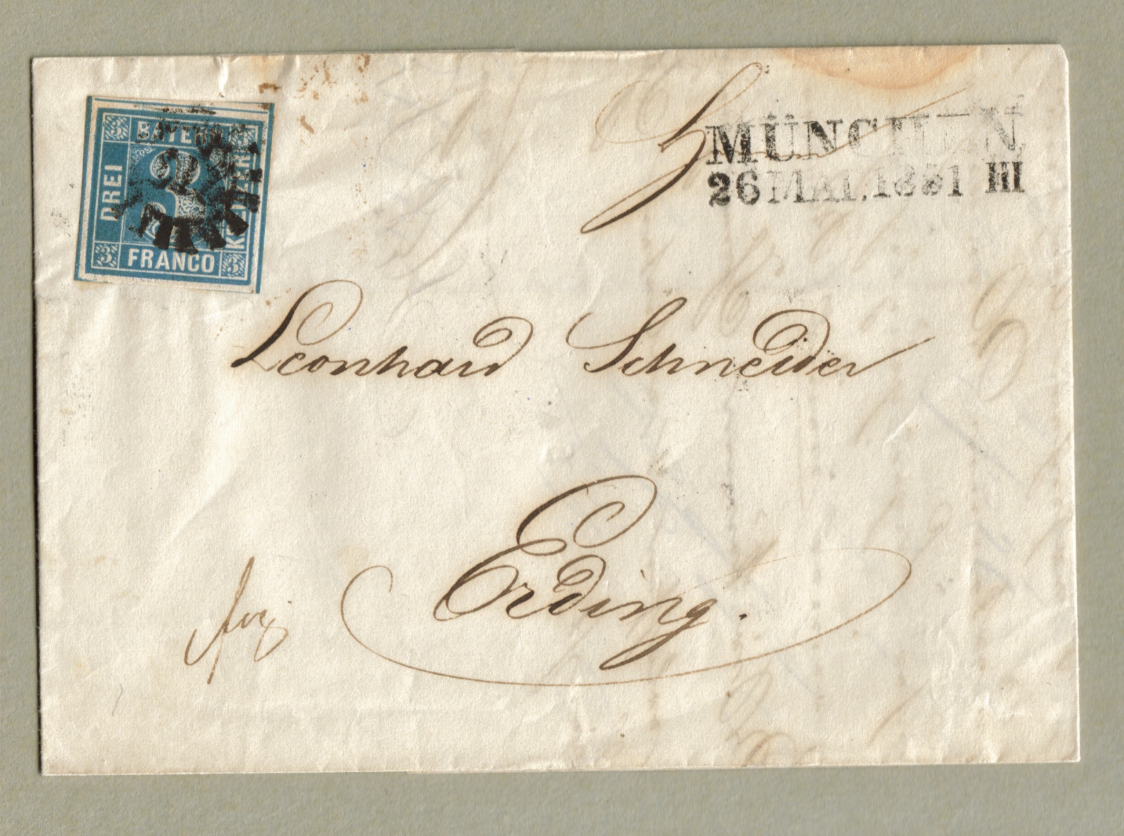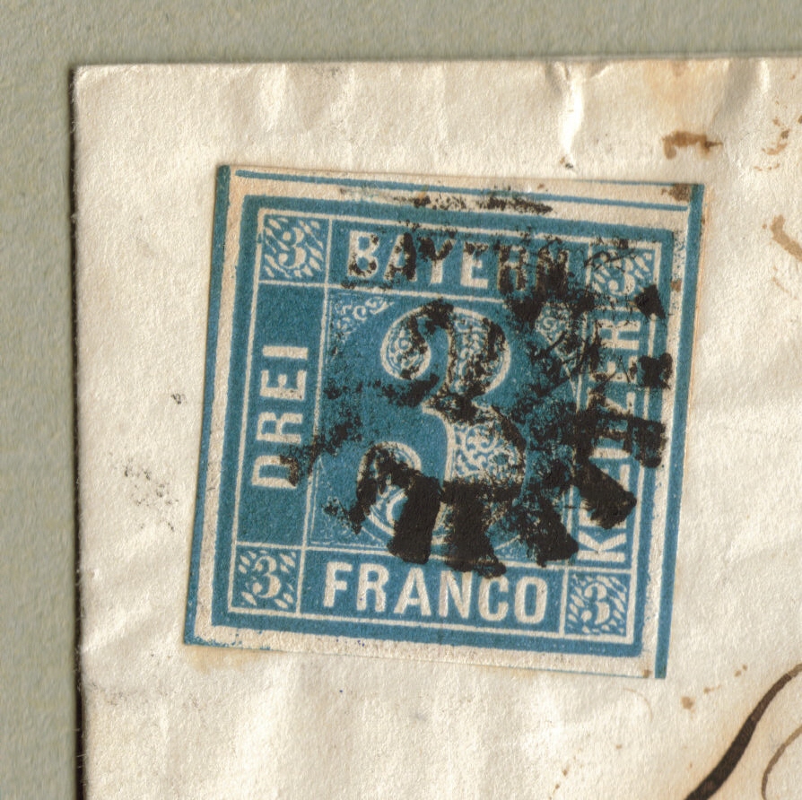 Dagegen wirkt die Marke des Briefes aus München (26. Mai 1851) völlig anders - dunkelblaue Farbe, beschädigte Dreier links oben und rechts unten, ohne Raute unter der 3 links unten, fast spitze Ecken, insgesamt stark an Platte 3 erinnernd).