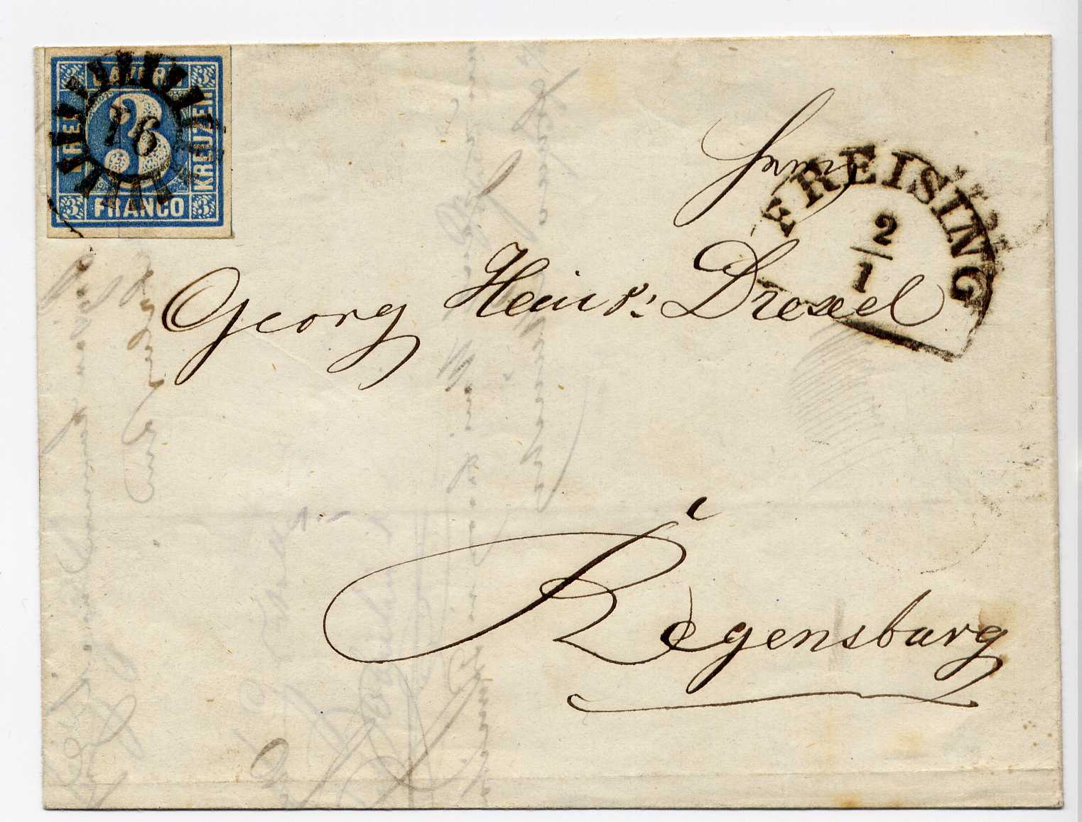 Der Brief wog 1 Loth und wurde mit 6 Kr. frankiert in die "Boite", also den Briefkasten geworfen. Da im Postverein das Loth exklusive galt (in Bayern inklusive!), war es somit ein Brief der 2. Gewichtsstufe. Hierfür wäre im Frankofall zu zahlen gewesen: