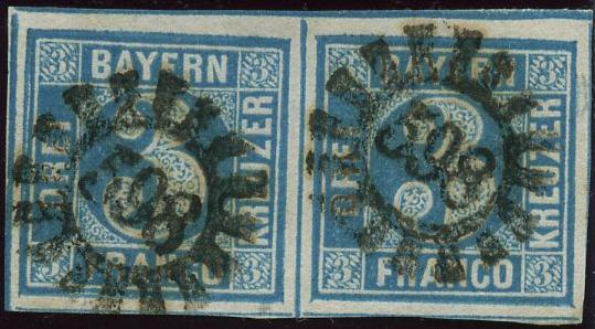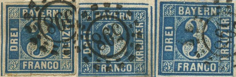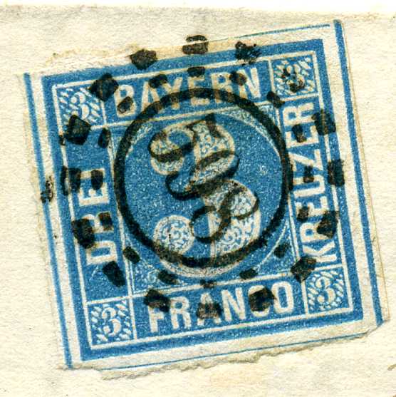 Möchte nur darauf hinweisen, dass mir 1 Brief von 1857 aus Würzburg vorliegt mit einer farbstarken Pl. 3, die im Druckbild dem hier gezeigten Stück ähnelt. Nicht in der Farbe. Ganz spitze Ecken, verlaufend fast. Und die Raute links unten fehlt - auch bei diesem Stück der Pl. 5 so gut wie nicht zu sehen).