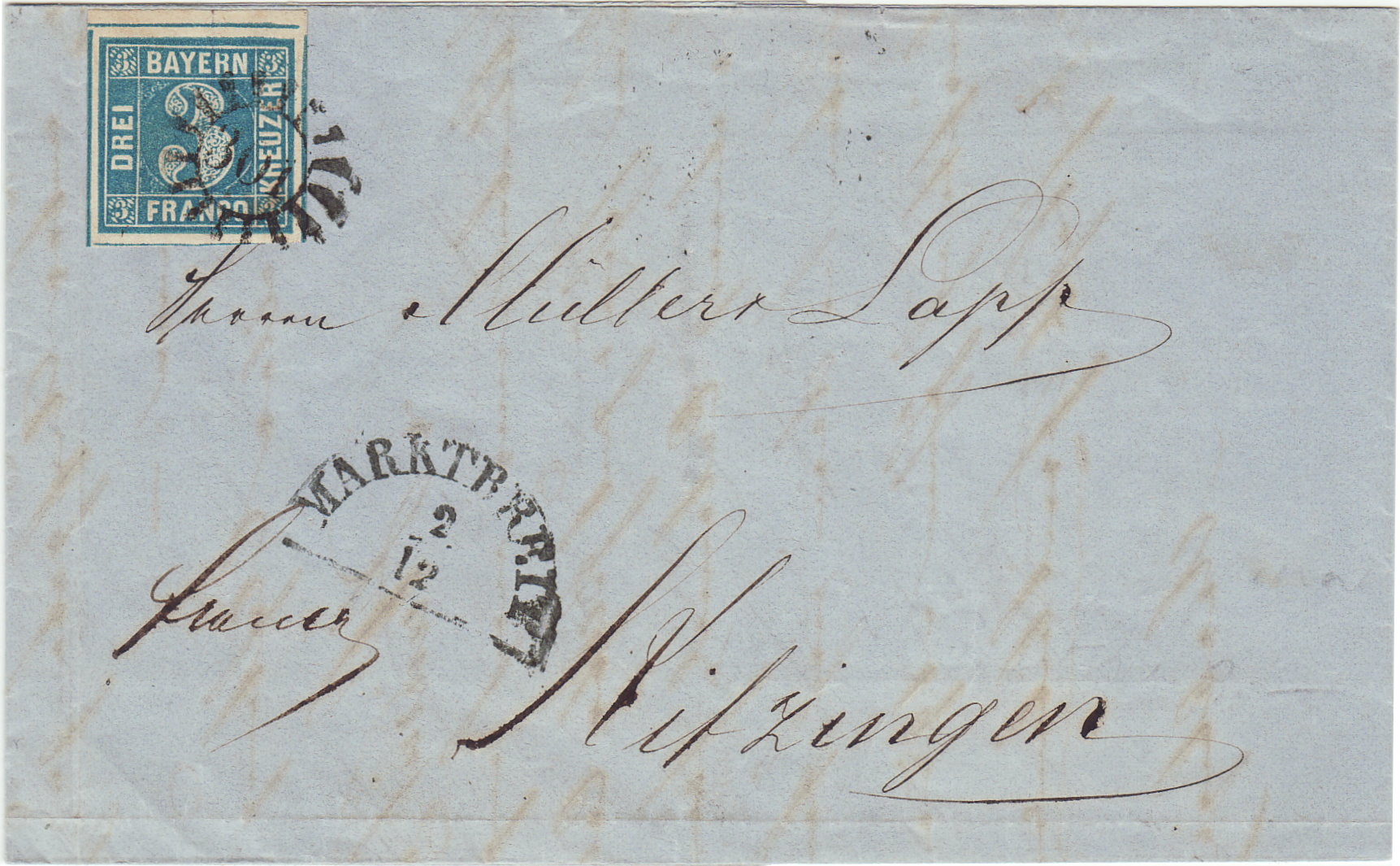 " Dann noch der Brief aus Würzburg von 1857. Kämen die Platten 3 und 4 in Frage. Ist aber ein helleres blau als auf dem Brief aus Augsburg (wenn dies eine 3 ist). Ausgezogene Ecke(n), na ja. Ein Fleck unter B? Schwierig zu beurteilen!