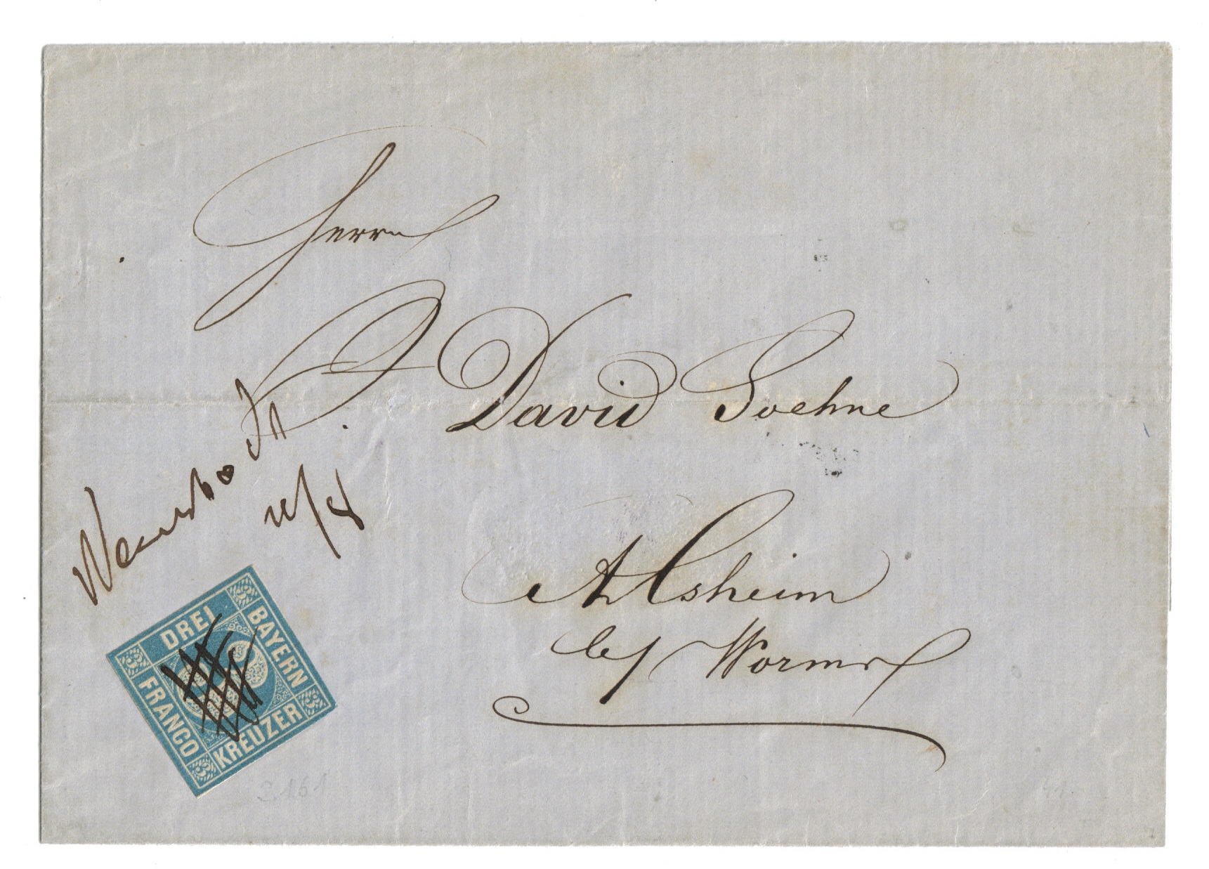 heute mal ein simpler 3 Kr.-Postvereins-Brief, jedoch Marke nicht gestempelt sondern nur mit Federzuggitter entwertet, und zusätzlichem Vermerk "Neustadt 22/8", nach Alsheim bei Worms.