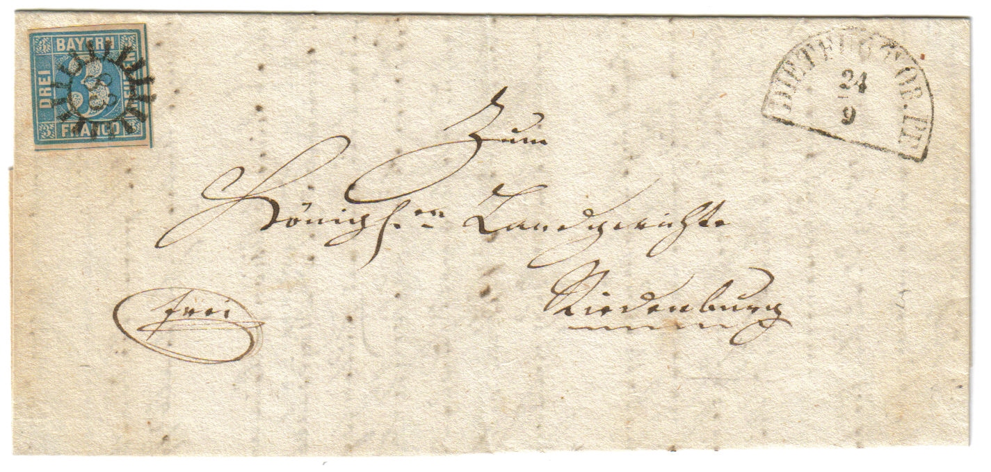 Hier der komplette Brief, gestempelt Dietfurt (Oberpfalz) 24. Sep. 1857, also klare Spätverwendung aus der 2. Verteilung. -