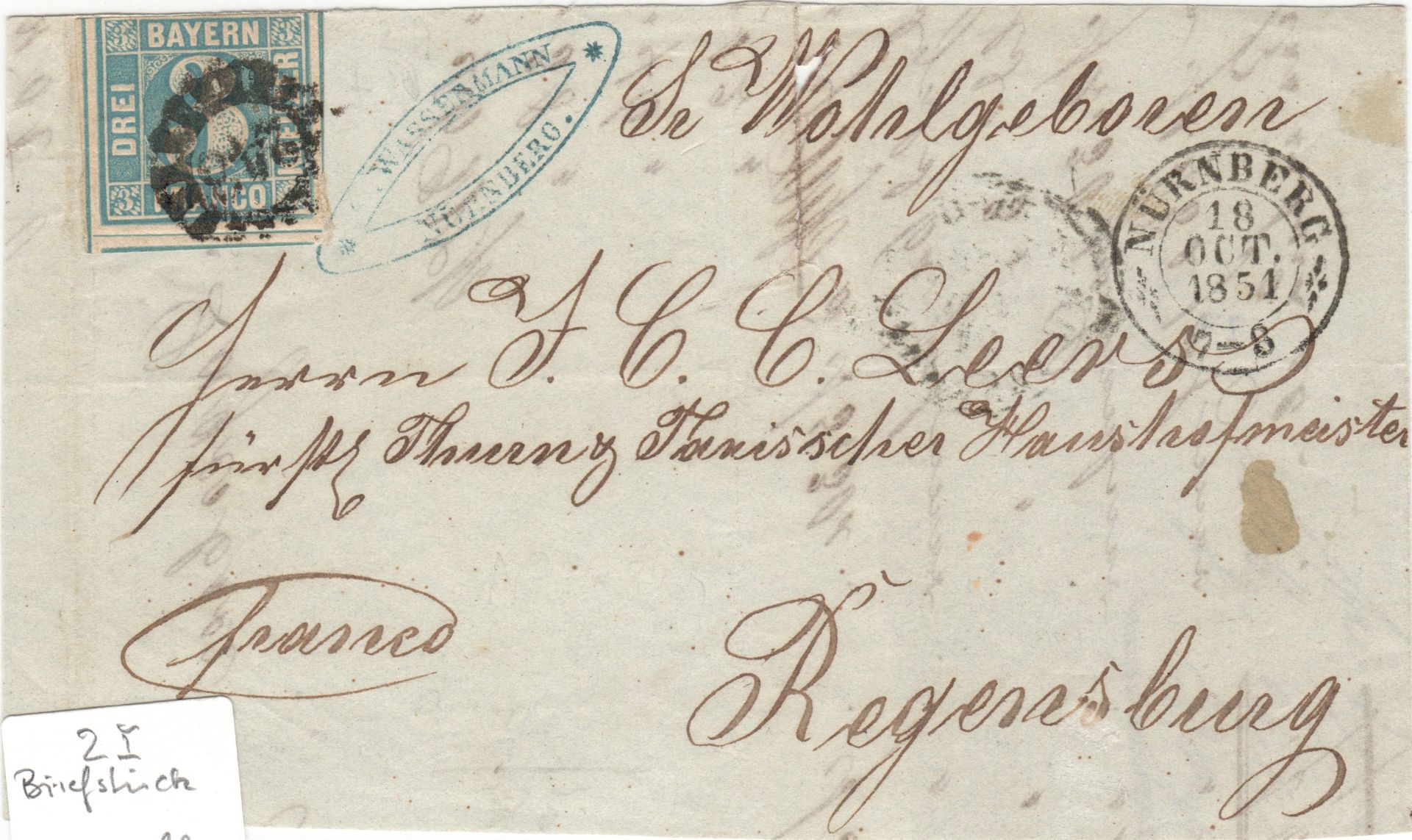 Der Umschlag ist gelaufen, Stempel von Nürnberg und Regensburg passen, auch der geschlossene Mühlrad Stempel passt nach Nürnberg (243 erste Stempel-Ausgabe vor der Umnummerierung), aber ...Die Entfernung Nürnberg-Regensburg wären doch mehr als 12 Meilen (90km), da müßte doch eigentlich eine 6Kr Marke drauf sein, oder ?