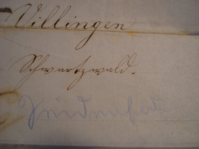 Die zweite Frage zu einem Vermerk auf einem Brief. Mit der Schrift bin ich in letzter Zeit einigermaßen voran gekommen, aber bei dem blauen Vermerk fällt mir partout nichts ein. Zumal es interessant wäre, ob er zeitnah oder nur eine Notiz späteren Datums ist.