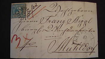 Von Landsberg am Lech nach Mühldorf am Inn sind es Luftlinie etwa 105 km, womit es ein Brief der 2. Entferngungsstufe war. Bis 1 Loth kostete ein solcher 6 Kr.. Dieser war gewiß nicht schwerer.