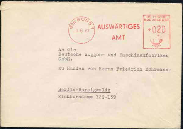 Um was für eine Post handelt es sich hier? Was mich verwundert, ist die Tatsache,dass der Brief auf der Rückseite als Absender die Deutsche Botschaft in Pakistan zeigt,der Beleg aber in Bonn abgestempelt wurde!