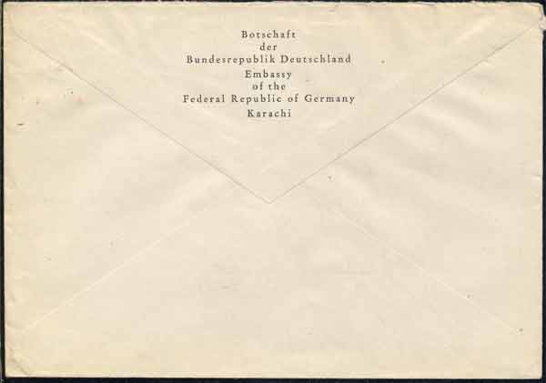 Um was für eine Post handelt es sich hier? Was mich verwundert, ist die Tatsache,dass der Brief auf der Rückseite als Absender die Deutsche Botschaft in Pakistan zeigt,der Beleg aber in Bonn abgestempelt wurde!