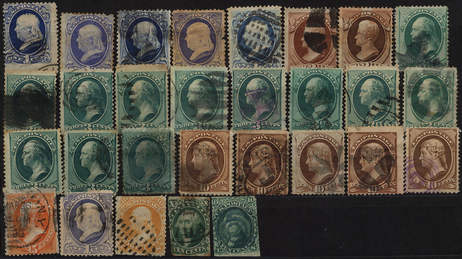 habe hier 2 und 3 Cent Marken von Washington mit div. Stempeln.