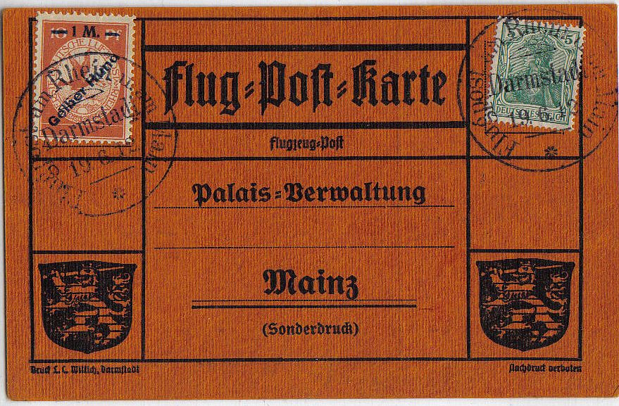 Die erste deutsche Postbeföderung mit Flugzeugen wurde am 11. Juni 1912 um 19.04 Uhr durch Leutnant von Hiddelsen mit seinem Euler-Flugzeug „Gelber Hund“ durchgeführt. In einem von der Reichspost versiegelten Beutel beförderte er 20.000 Briefe und Postkarten von Frankfurt am Main nach Darmstadt. Er erreichte eine Höhe von 900 bis 1500 m. Für den Flug wurden 13 Minuten und 20 Sekunden benötigt. Nach kurzem Aufenthalt flog er weiter nach Worms. Sowohl in Frankfurt als auch in Darmstadt waren auf dem Flugplatz Postämter errichtet worden. Es handelte sich um eine Aktion zu wohltätigen Zwecken. Sie stand unter der Schirmherrschaft der Großherzogin von Hessen.
