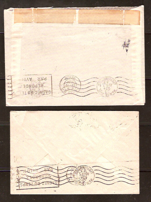 Ich hoffe, dass jemand zu den beiden unten gezeigten Flugpstbriefen aus dem Jahr 1937 etwas ergaenzende Information liefern kann, z. B. die Markenbewertung auf Brief. Rueckseitig gibt es je zwei Franzoesische Maschinen-Ankunftsstempel Paris R.P. Avion und Paris Distribution. Ich finde die Briefe ganz dekorativ, auch mit den Randstuecken. Gleichwohl sind sie in "bessere" Haende abzugeben, da ich mich nicht so fuer die Thematik interessiere.