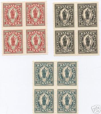 ich habe 3 Viererblöcke von der Patrona Bavaria 1920 erstanden,(Michel 187 - 189 - 190) postfrisch, im Katalog nur MIT FALZ verzeichnet, habe sie aber alle OHNE, Superzustand, Super Gummi, die 2.1/2 Mark (Nr. 190) als Steindruck hat auf abweichendem bräunlichen Papier gleich zwei Plattenfehler in ein und derselben Marke dieses Blockes. Einmal ist ein Rautenfeld des bayrischen Wappens, auf dem die Patrona steht, mit Farbe gefüllt statt schraffiert und zwischen A und R der MARK findet sich ein heller (grauer) Fleck.