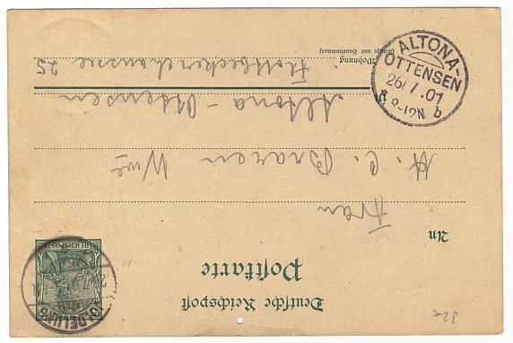Ein bisher noch nicht gezeigter Stempel von ALTONA-OTTENSEN 26.07.01 als Ankunftstempel auf einer Postkarte von Joldelund (bei Kiel) gibt mir Rätsel auf, die mir vielleicht ein Hamburg-Spezialist beantworten kann. In der Stempeldatenbank ist Ottensen als eigenständiger Postort mit verschiedenen Stempeln (allerdings nicht mit KOS) abgebildet. wurde aber immer als Hamburg zugehörig dargestellt. In dem nun gezeigten KOS wird der Ort Ottensen aber Altona zugeordnet, so auch im Post-Taschen-Atlas von 1913. Ist die Bezeichnung in der Stempel-Datenbank falsch?
