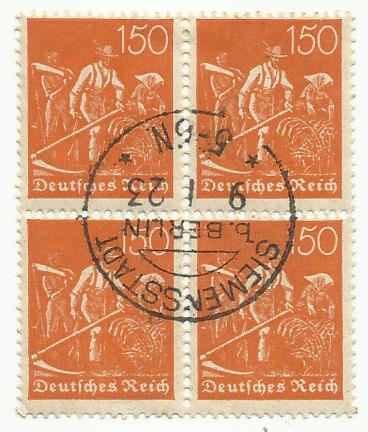 Dieser schön abgeschlagene KOS Siemensstadt auf einem gummierten Viererblock der Mi 189 (9.1.1923)befand sich in einer umfangreicheren Restesammlung.