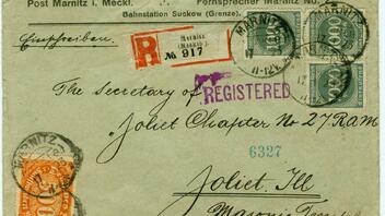 Hier ist noch ein Brief mit KOS Stempel. Sendet aus Marnitz am 17.8.1923 nach Joliet, USA mit Einschreiben. Möglicherweise Unterfrankiert, siehe unter "Infla Portofrage".