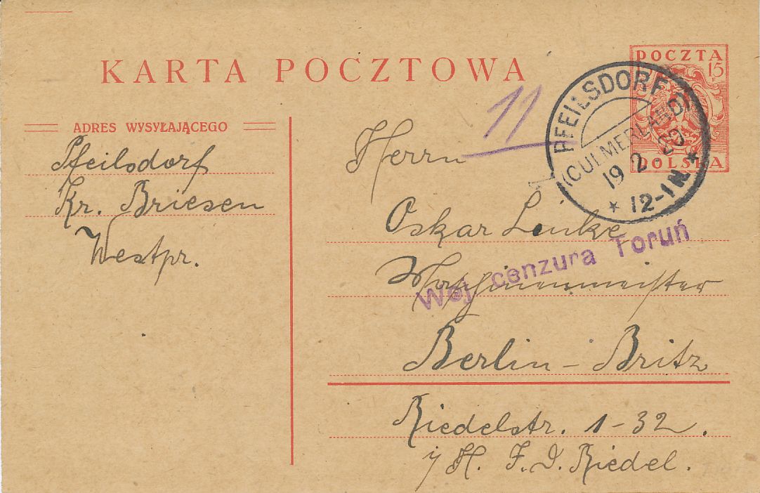 in diesem Falle eine polnische Ganzsache von Pfeilsdorf nach Berlin vom 19.2.1920