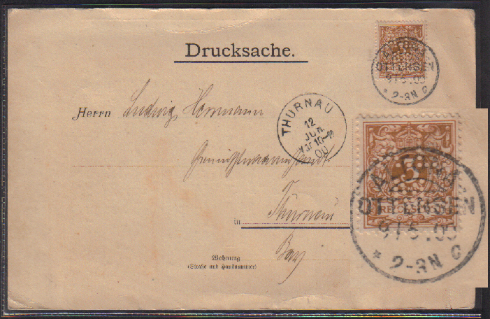 Gelocht ist die DR Germania 5Pf. mit den Initialen V.B.F.G verwendet wurde diese Lochung von der "Vereinigte Berlin-Frankfurter Gummi-Fabrik" in Gelnhausen im Zeitraum von ca.1893 - 1934. Der KOS ist eine Typ V/1 aus Berbisdorf/ Schlesien OPD Liegnitz, bekannt aus dem Zeitraum ca.1890-1929.