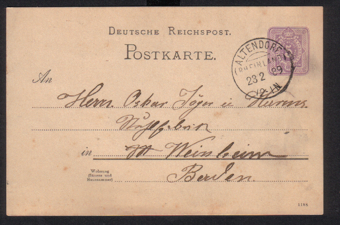 Eine interessante Postkarte mit zwei mal KOS 1x Bonn-/Poppelsdorf OPD Cöln Typ V/3, das wäre ja noch nix besonderes außer vielleicht, der Stempel ist natürlich auf einer gelochten Mi.Nr.46 FSV für F.Soennecken´s Verlag in Bonn, ist aber in wircklichkeit auch noch nichts richtig besonderes, besonders ist der KOS Ankunftsstempel Allfeld/Baden OPD Karlsruhe in Typ V/3 in dieser Typen Form noch nicht im KOS-Handbuch v.Dieter Sejak verzeichnet bzw.n.nicht bekannt und noch dazu mit einem neuem LD.