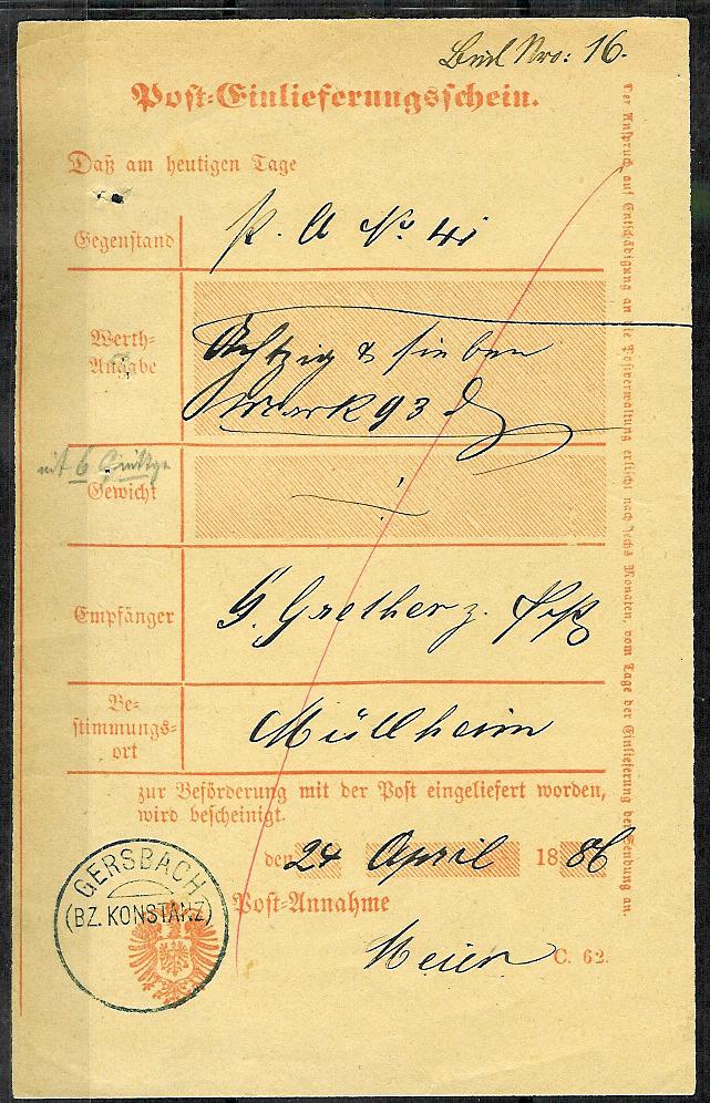 und wo wir schon bei Eilieferungsscheinen sind: GERSBACH (BZ. KONSTANZ) vorgestempelt ohne Datum auf Einlieferungsschein für PA