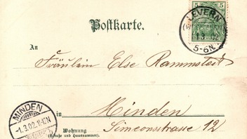 Postkarte aus Levern (Westfalen) nach Minden (Westf.) vom 1.3.02. Laut Dieter Sejaks KOS-Registratur wurde dieser KOS vom 15.8.84 bis 12.8.11 verwendet. Meine Karte liegt also mittendrin.