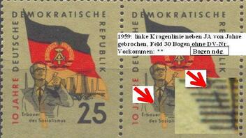 Da hat er recht, T_S verbunden ist ein primärer PF, kommt immer auf dem gleichen Feld 6 des 10er Klischees vor. Bei der Verfielfältigung dieses Klischees ist natürlich auf den Kopien immer wieder an der gleichen Stelle im Feld 6 dieses T_S zu finden. Je nach dem wie oft dieses Klischee im Druckbogen verwendet wurde, kommt es immer in der senkrechten Spalte 1 + 6 der Schaltebogen, wie auch der MH und RM vor. Ist also eigentlich als Feldmerkmal anzusehen. Demzufolge müsste dieser PF I eigentlich wieder aus dem Michel raus, da spielen die Jungs nur nicht mit, wobei so einige sog. PF bei Ulbricht dort auch wieder entfernt werden müssten.
