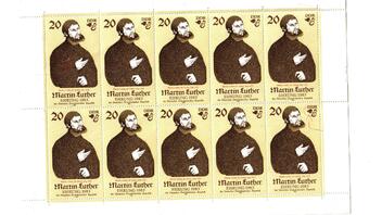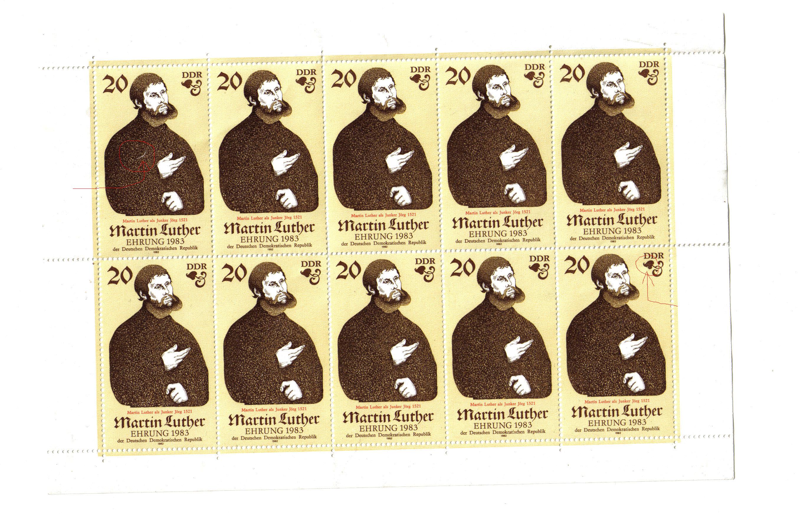 Weisser Riß im Oberarm von Luther (1.Marke)Bruch der Zierblume unter DDR (10.Marke)