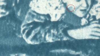 2) Fleck in der linken Backe des unteren Mannes.