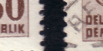 Am Bildrand rechts neben "DDR" hat die Marke einen weißen Fleck - kann man auch als "rechter Rand und erste senkrechte Linie in Höhe von DDR 0,8mm unterbrochen" beschreiben.