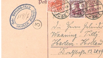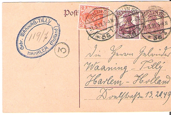 "BERLIN SO / * 36 b", K1-Stegstempel mit Bögen oben und unten vom 31.3.21 und K1 "3" auf 15 Pf.-Postkarte mit zusätzlichen 10 Pf. und 15 Pf. "Freimarken: Germania" nach NL-Haarlem. Blauer ovaler Firmenstempel "Gebr. WAANING-TILLY / HAARLEM (Holland)" als Ankunftstempel. Deutsches Reich, Michel-Nr. P 116 und zusätzliche Marken Deutsches Reich, Michel-Nr. 100 und 141 als portogerechte Auslands-Postkarte aus der Zeit vom 6.5.1920 bis zum 31.3.1921, also vom letzten Tag vor der Portoerhöhung am 1.4.1921.
