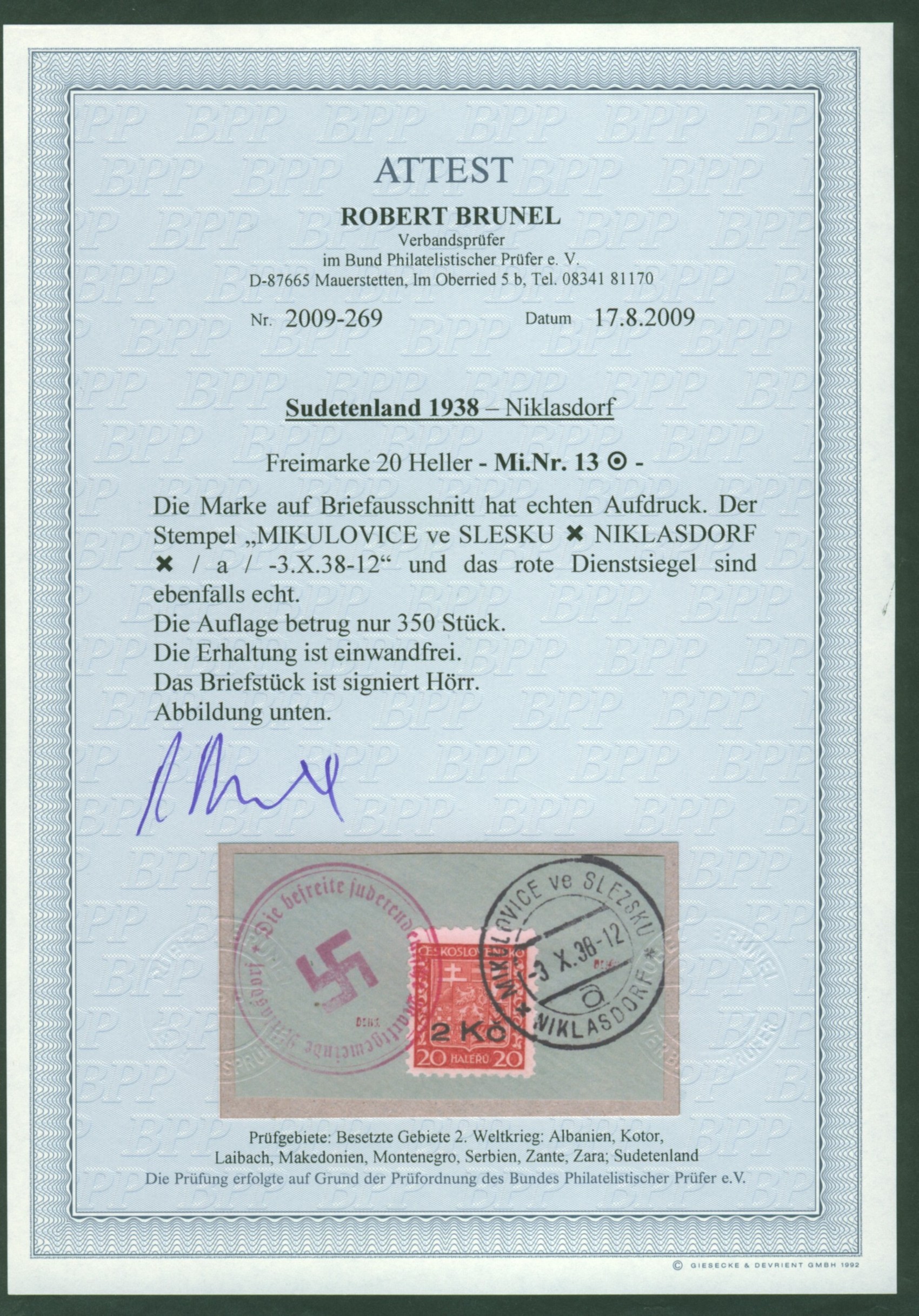 Der Stempel ist der Postamtsstempel von Reichenberg 1 vom 08.10.38. Nebengesetzt der Befreiungsüberdruck, mit dem die Hindenburgmarken peinlich genau nicht überstempelt wurden. Schliesslich waren es ja bereits deutsche Marken.