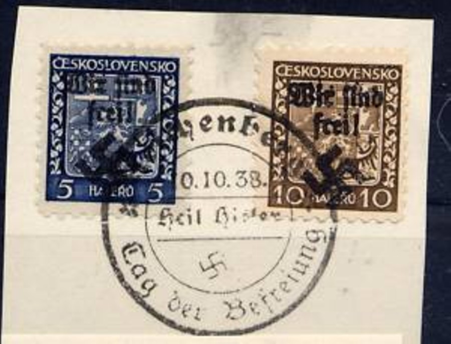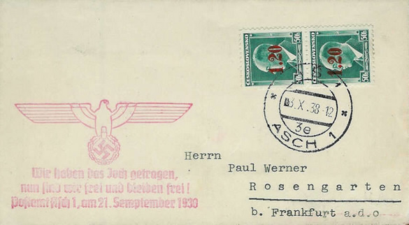 Habe hier eine Ansichtskarte eines Zeltlagers für Jugendliche, auf der Rückseite eine Marke vom Sudetenland Asch Michel-Nr. 2, Überdruck 1,20 auf 10. H., gefälligkeitsgestempelt mit dem Tagesstempel As - Asch vom 30.9.1939 und einem roten Zusatz-Stempel mit Reichsadler, Hakenkreuz und der Inschrift: "Wir haben das Joch getragen, nun sind wir frei und bleiben frei! Postamt Asch 1, am 21. September 1938.