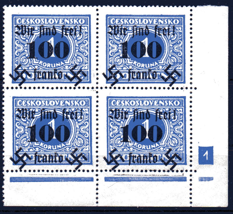 Zunächst Rumburg 43 als Eckvierer mit Plattennummer und der Abart Nr. I auf der rechten senkrechten Bogenreihe (linkes HK nach rechts geneigt) sowie die Niederländer gezähnt mit entsprechendem Attest.