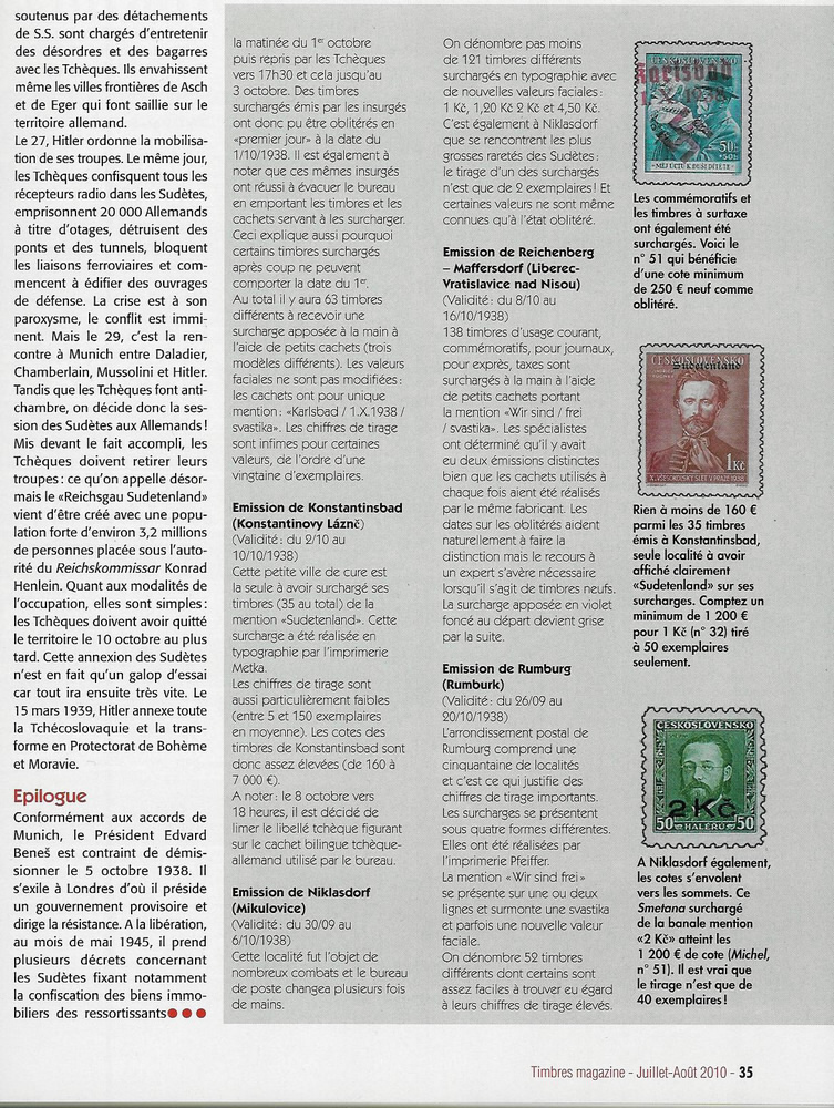 Und hier der angekündigte 5 seitige Artike des Magazins "Timbres"l in französisch. Damit dürfte der lokale Charakter endgültig passe´sein. Auch international wird das Gebiet Sudetenland entdeckt, als äußerst interessantes Gebiet mit geringen Auflagen und (noch) sehr günstigen Preisen. :D :D :D