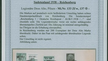 Es handelt sich um einen Umschlag mit u.a. einer Reichenberg Mi.Nr. 133 Zf w, also einem waagerechten Zierfeld an einer "Doss Alto" - Legionärsmarke.